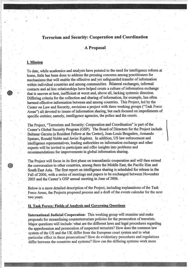 [Editorial Note: Project Proposal made by Judge Baltasar Garzón and meant to count with the participation, among others, of John Negroponte, Director of US Intelligence. The estimated budget for this "Terrorism and Security: Cooperation and Coordination" proposal amounted to 1,234,200 dollars.