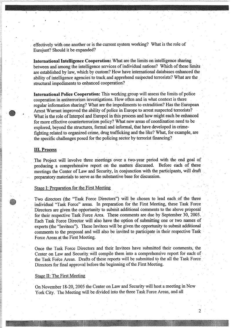 The Second Meeting, to take place on May 25, 2006 at La Pietra, in Florence, Italy will be a closed meeting as part of the Center on Law and Security's annual conference on Terrorism. The goal of this meeting is to develop a holistic view on counterterrorism with the benefit of the perspective from each of the three Task Force Areas. At this meeting, the Task Force Directors will present their reports and findings, followed by a discussion involving all the directors.