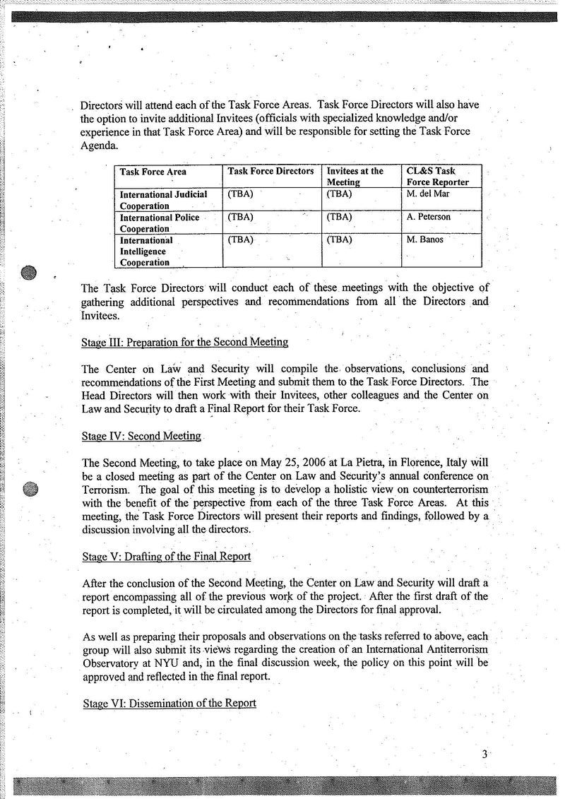 Task Force Area Task Force Directors Invitees at the Meeting CL&S Task Force Reporter International Judicial Cooperation (TBA) (TBA) M. del Mar International Police Cooperation (TBA) (TBA) A. Pelerson International Intelligence Cooperation (TBA) (TBA) M. Bancs The Task Force Directors will conduct each of these meetings with the objective of gathering additional perspectives and recommendations from all the Directors and Invitees.