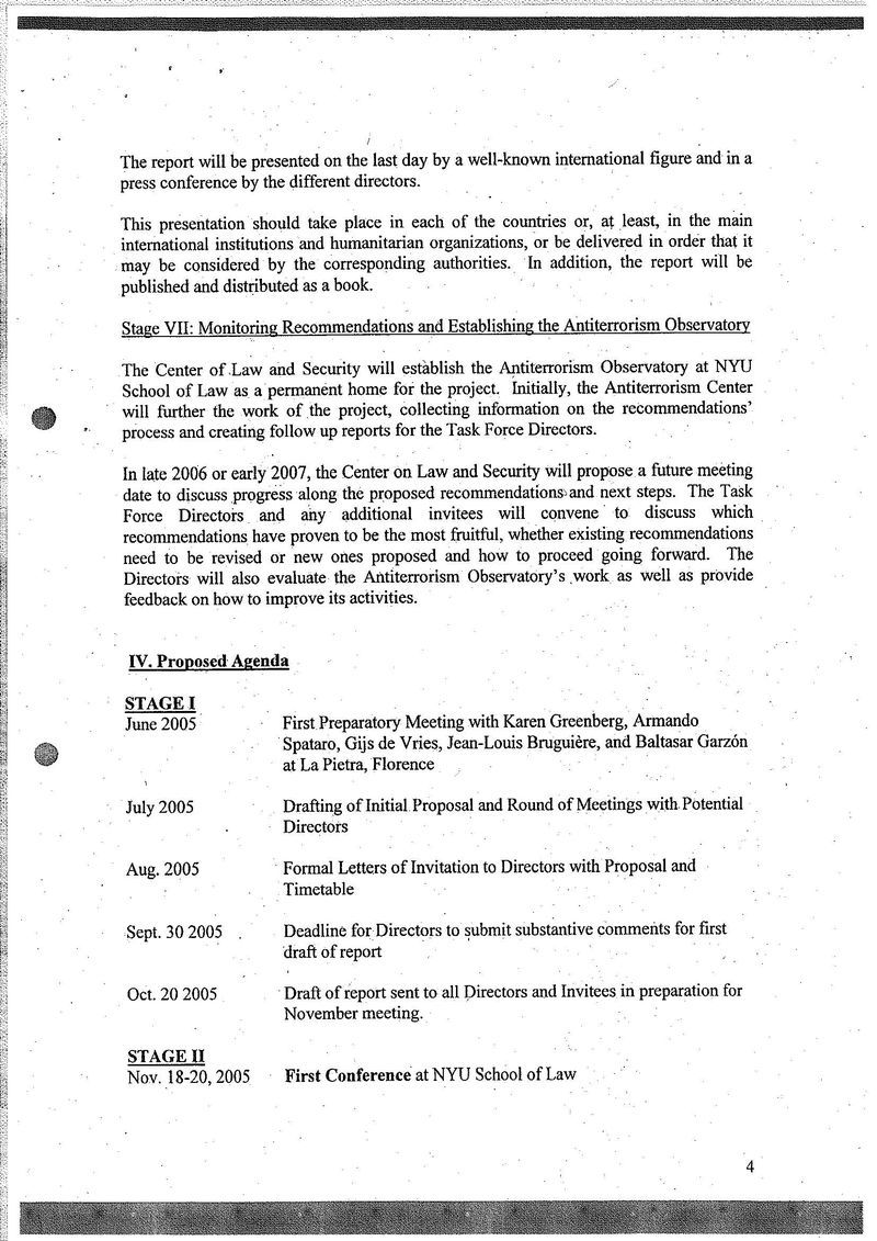June 2005 First Preparatory Meeting with Karen Greenberg, Armando Spataro, Gijs de Vries, Jean-Louis Bruguipere, and Baltasar Garzón at La Pietra, Florence July 2005 Drafting of Initial Proposal and Round of Meetings with Potential Directors Aug. 2005 Formal Letters of Invitation to Directors with Proposal and Timetable Sept. 30 2005 Deadline for Directors to submit substantive comments for first draft of report Oct. 20 2005 Draft of report sent to all Directors and Invitees in preparation fur November meeting. STAGE II