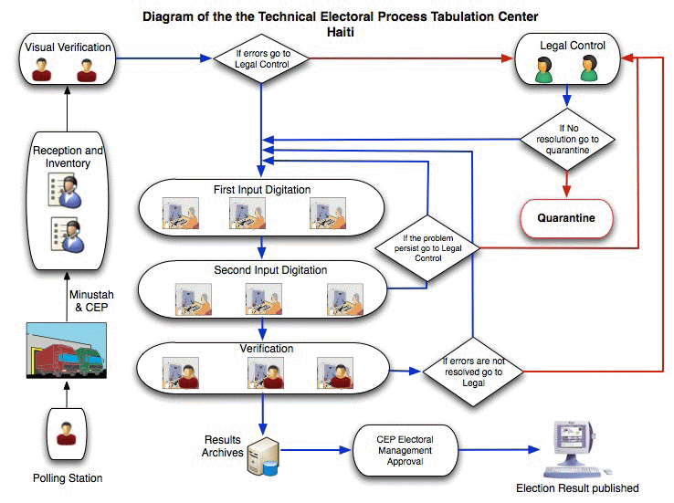 1. Transport: Once polling officials complete the vote count and record the information on the Procès-Verbal and other documentation, CEP and MINUSTAH transfer the sachets Intake Centers and consequently transported to the national Tabulation Center in Port-au-Prince.