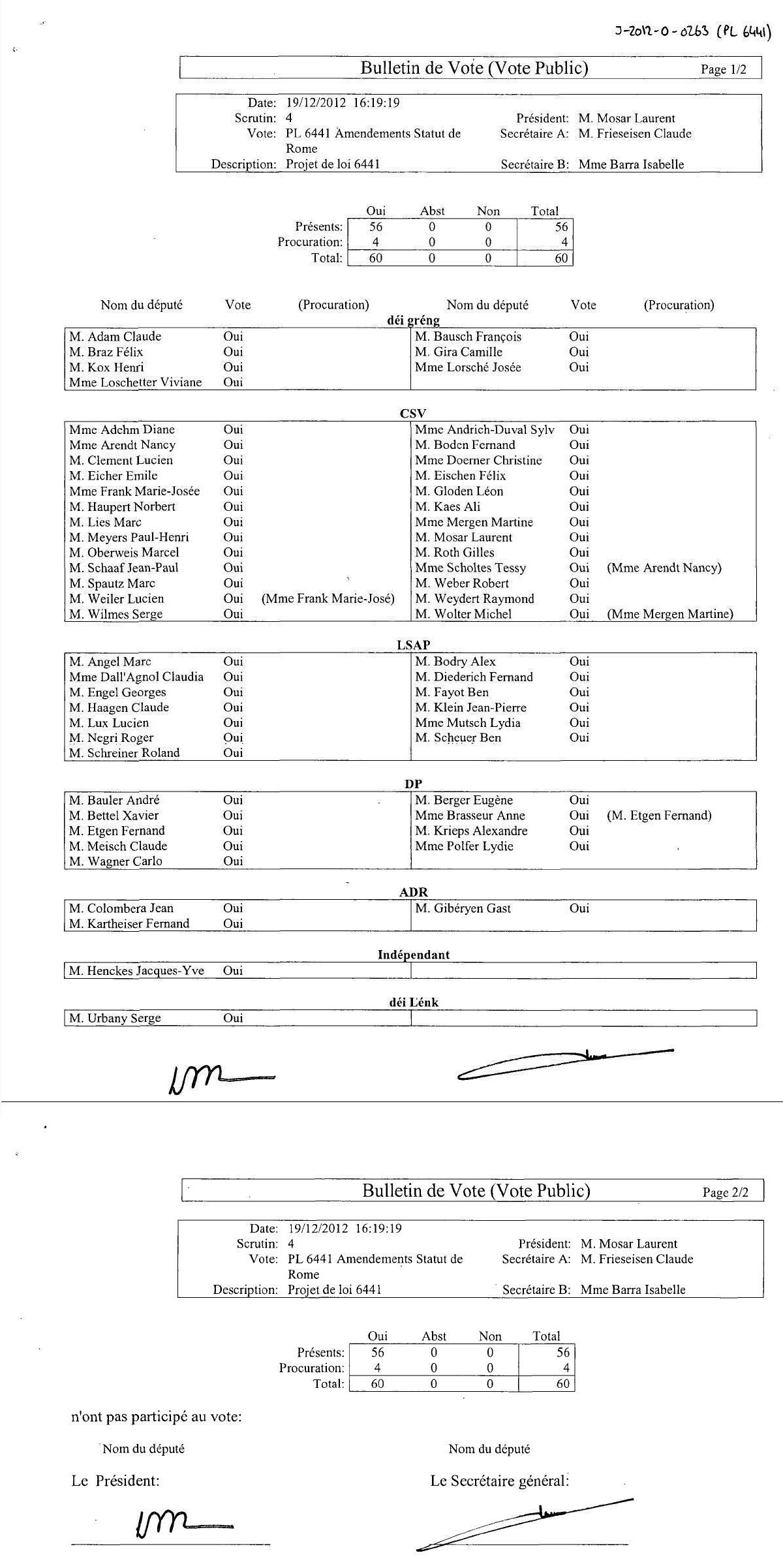 6441 - Projet de loi portant approbation des amendements apportés au Statut de Rome de la Cour pénale internationale par la résolution RC/Res.5 et par la résolution RC/Res.6 adoptées à la Conférence de révision du Statut de Rome de la Cour pénale internationale, à Kampala, les 10 et 11 juin 2010 -Rapporteur : Monsieur Paul-Henri Meyers Rapport de la Commission juridique Monsieur Paul-Henri Meyers, rapporteur Discours Monsieur François Biltgen, Ministre Vote sur l'ensemble du projet de loi Dispense accordée Vote(s) / Autres modes d'évacuation :