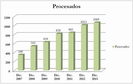 En primer lugar, se ha registrado un total de 1069 procesados (es decir, personas respecto de las cuales se dictó al menos un auto de procesamiento). Tal como refleja el siguiente gráfico, el número de procesados continúa creciendo exponencialmente.