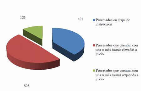 Mientras que 525 de las personas procesadas ya cuentan con una o más causas elevadas a juicio, 123 tienen alguna causa en la que la fiscalía solicitó la elevación a juicio |3|. Por consiguiente, 60,62% (648) del total de personas procesadas cuentan con una causa elevada a juicio o con requerimiento de elevación a juicio presentado por el Ministerio Público Fiscal. Además, aproximadamente el 41,71% del total de elevados a juicio (219) ya ingresó a la etapa de juicio propiamente dicha (audiencias de debate) y se encuentra próximo a obtener una sentencia definitiva a su respecto.