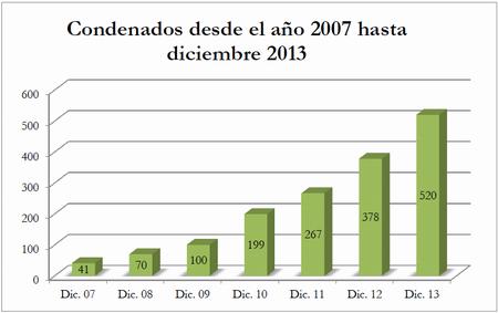 El número total de condenados también ha crecido exponencialmente. Hasta 2008 había 70 personas condenadas, al finalizar el año 2009 ese número aumentó a 100, a fines de 2010 a 199, mientras que para el 2011 se condenó a 267. En el 2012, el número de condenados aumentó a 378 personas y, por último, en el año 2013 se condenó a 160 personas |5|, 142 de las cuales han sido condenadas por primera vez. Esto muestra que el proceso de juzgamiento por delitos de lesa humanidad ha alcanzado su punto de máxima expansión.