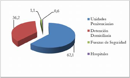 Resulta importante resaltar el aumento en términos absolutos de personas detenidas, ya que estas eran 593 y 813 en los meses de diciembre de 2011 y de 2012, respectivamente. Asimismo, se advierte que en el último año creció el porcentaje de personas detenidas en institutos carcelarios, pasando del 50.5% en 2011 al 58.9% en el 2012, hasta arribar al 62,1% en la actualidad.