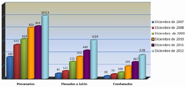Como se advirtió más arriba, si bien la etapa de juicio oral es la que más progreso ha tenido, lo cierto es que la cantidad de procesados también ha ido aumentando -de 843 en 2011 a 1013 en lo que va del 2012-. Ello da cuenta de que la actividad en instrucción aún se encuentra activa y que se ha podido determinar la responsabilidad penal de nuevos imputados.