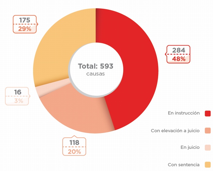 La instancia más avanzada corresponde a las 16 que se encuentran actualmente en juicio, en la etapa de debate oral o juicios escritos (bajo la modalidad del viejo Código Procesal Penal). De éstas, dos se iniciaron en 2017 y el resto, entre 2012 y 2016.