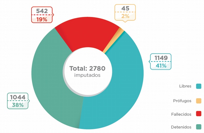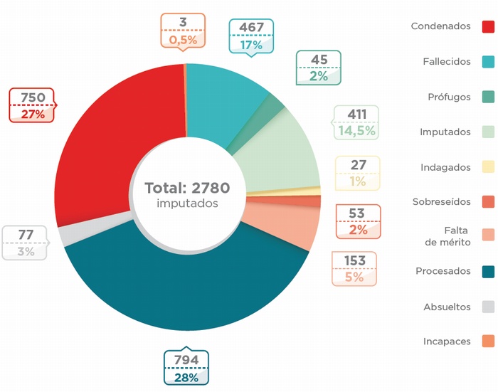 Cerca del 30% de los imputados han sido sentenciados (750 condenados y 77 absueltos, lo que representa un tercio del total).