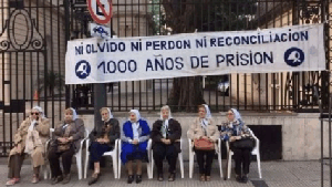 Las Madres de Plaza de Mayo protestaron hoy frente al Episcopado por la propuesta de la Iglesia de convocar a una "reconciliación" entre familiares de detenidos y militares. Lo hicieron a través de una iniciativa encabezada por Hebe de Bonafini, que consistió en una sentada frente a la sede del Episcopado, ubicada en Suipacha al 1032, donde colgaron una bandera con la consigna "Ni olvido, ni perdón, ni reconciliación: 1000 años de prisión".