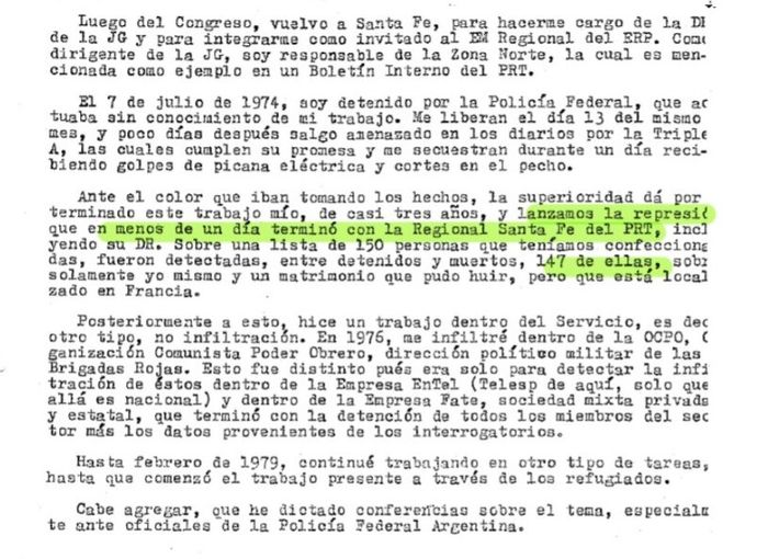 "Ante el color que iban tomando los hechos, la superioridad da por terminado este trabajo mío, de casi tres años, y lanzamos la represión que en menos de un día terminó con la Regional Santa Fe del PRT, incluyendo su DR (dirección regional). Sobre una lista de 150 personas que teníamos confeccionada fueron detectadas, entre detenidos y muertos, 147 de ellas", detalló con frialdad. Según sus cálculos, solamente habían sobrevivido él y un matrimonio que huyó, pero que lo tenían localizado en Francia.