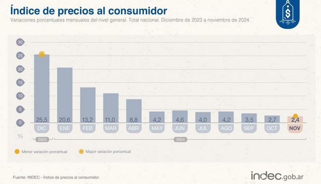 En este marco, las predicciones del Ejecutivo lucen por de más optimistas. Según consta en el proyecto de Presupuesto 2025 --aún atorado en el Congreso-- el Gobierno estimó que la inflación acumulada del año entrante será de apenas el 18% (a razón de 1,3% mensual): la cifra contrastaría drásticamente con el 211,4% registrado en 2023 y el 112% acumulado en lo que va del 2024 (a falta de un mes para su cierre).