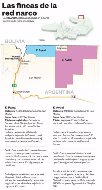 El tribunal, luego de confirmar los procesamientos de los hermanos Delfín y Raúl Castedo, como jefe y miembro de una asociación ilícita narco, ordenó el pasado 19 de junio la anotación de la causa en las cédulas parcelarias de ambos inmuebles, ubicados en el borde caliente de Salvador Mazza (Salta) con Tarija (Bolivia). La medida, que hasta ayer seguía sin hacerse efectiva en los asientos de la Dirección General de Inmuebles, apunta a evitar cambios registrales en esos catastros fronterizos que, con la ley de extinción de dominio trabada en el Senado de la Nación, continúan en poder de presuntos integrantes de la organización criminal.