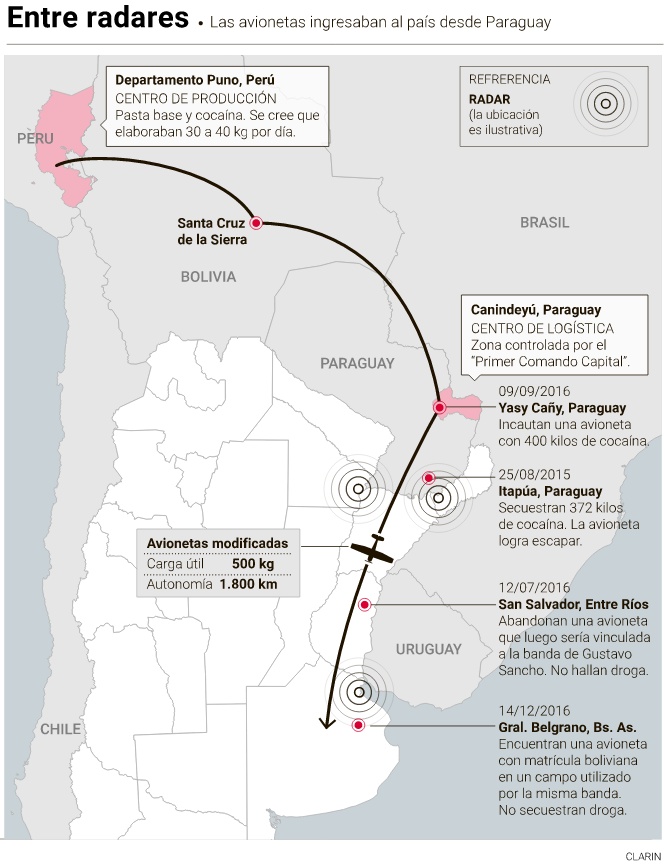 Dueño de una ruta narco sofisticada - con postas desde Puno (Perú), pasando por Santa Cruz de la Sierra (Bolivia) y Canindeyú (Paraguay)- los investigadores aseguran que Sancho tercerizaba la logística de los envíos en avionetas que llegaban, principalmente, a territorio bonaerense.