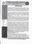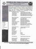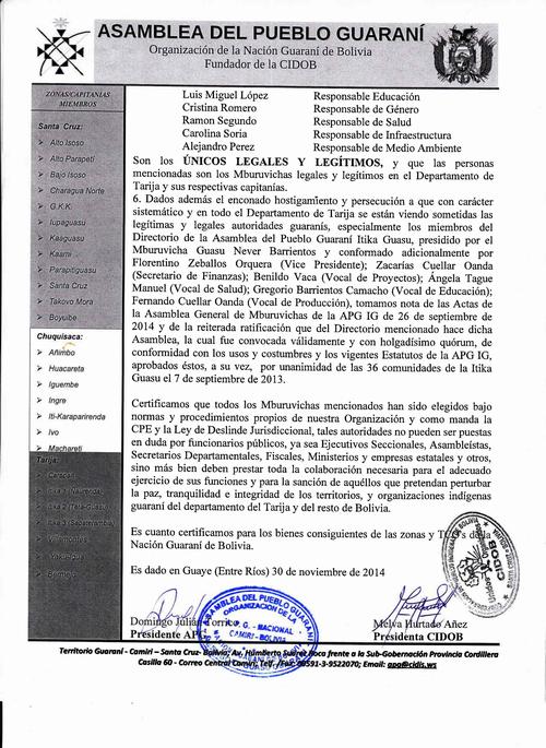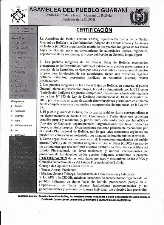 Certificamos que todos los Mburuvichas mencionados han sido elegidos bajo normas y procedimientos propios de nuestra Organización y como manda la CPE y la Ley de Deslinde Jurisdiccional, tales autoridades no pueden ser puestas en duda por funcionarios públicos, ya sea Ejecutivos Seccionales, Asambleístas, Secretarios Departamentales, Fiscales, Ministerios y empresas estatales y otros, sino más bien deben prestar toda la colaboración necesaria para el adecuado ejercicio de sus funciones y para la sanción de aquéllos que pretendan perturbar la paz, tranquilidad e integridad de los territorios, y organizaciones indígenas guaraní del departamento del Tarija y del resto de Bolivia.