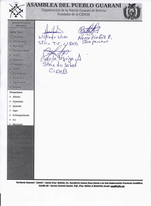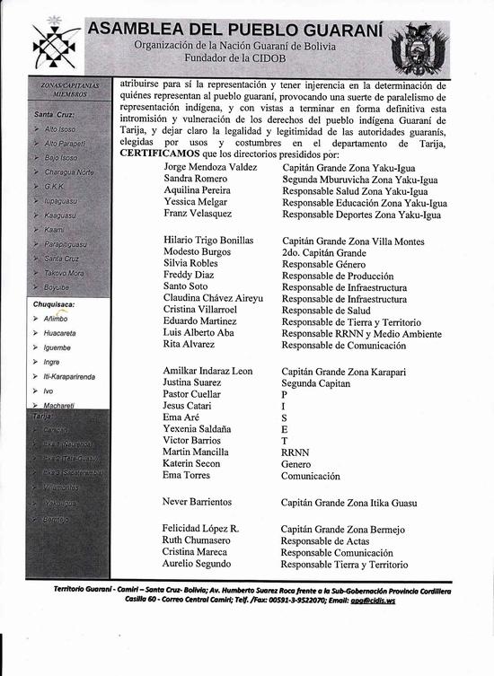 - Mariana Seoane Taborga, Responsable de comunicación y Educación5. La APG y la CIDOB, máximas instancias de representación orgánica de los pueblos indígenas de tierras bajas de Bolivia, preocupados porque en el Departamento de Tarija algunas instituciones gubernamentales y no gubernamentales y personas de manera individual y/o colectiva han pretendido atribuirse para sí la representación y tener injerencia en la determinación de quiénes representan al pueblo guaraní, provocando una suerte de paralelismo de representación indígena, y con vistas a terminar en forma definitiva esta intromisión y vulneración de los derechos del pueblo indígena Guaraní de Tarija, y dejar claro la legalidad y legitimidad de las autoridades guaranís, elegidas por usos y costumbres en el departamento de Tarija, CERTIFICAMOS que los directorios presididos por: