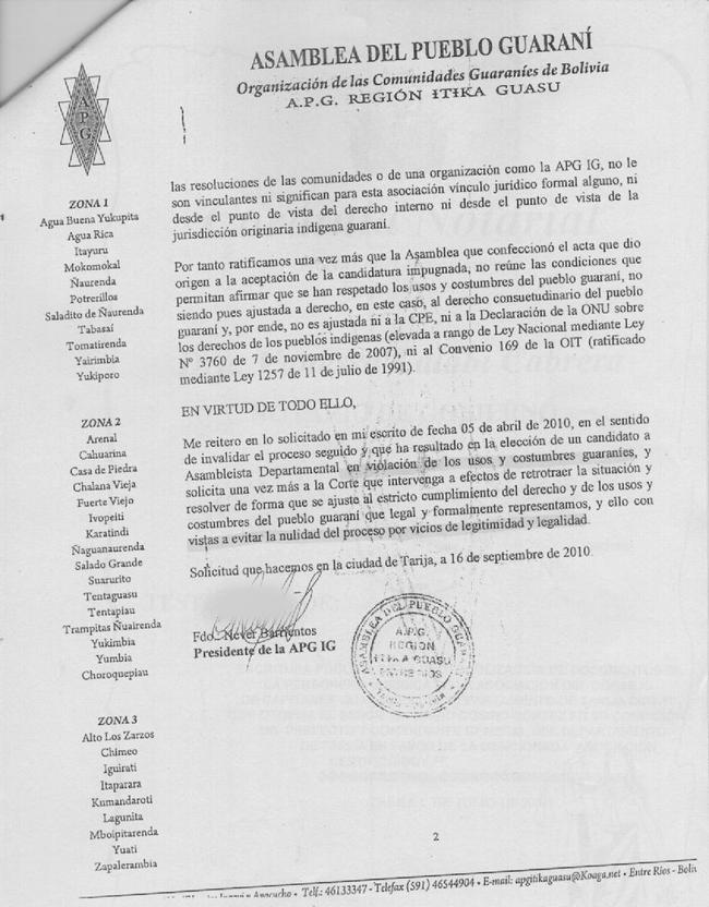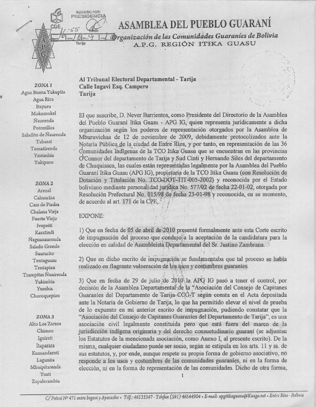 TarijaEl que suscribe, D. Never Barrientos, como Presidente del Directorio de la Asamblea del Pueblo Guaraní Itika Guasu - APG IG, quien representa jurídicamente a dicha organización según los poderes de representación otorgados por la Asamblea de Mburuvichas de 12 de noviembre de 2009, debidamente protocolizados ante la Notaría Pública de la ciudad de Entre Ríos, y por tanto, en representación de las 36 Comunidades Indígenas de la TCO Itika Guasu que se encuentran en las provincias O'Connor del departamento de Tarija y Sud Cinti y Hernando Siles del departamento de Chuquisaca, las cuales están representadas legalmente por la Asamblea del Pueblo Guaraní Itika Guasu (APG IG), propietaria de la TCO Itika Guasu (con Resolución de Dotación y Titulación No. TCO-DOT-TIT-005-2002) y reconocida por el Estado boliviano mediante personalidad jurídica No. 577/02 de fecha 22-01-02, otorgada por Resolución Prefectural No. 015/98 de fecha 23-01-98 y reconocida, en su momento, de acuerdo al art. 171 de la CPE,