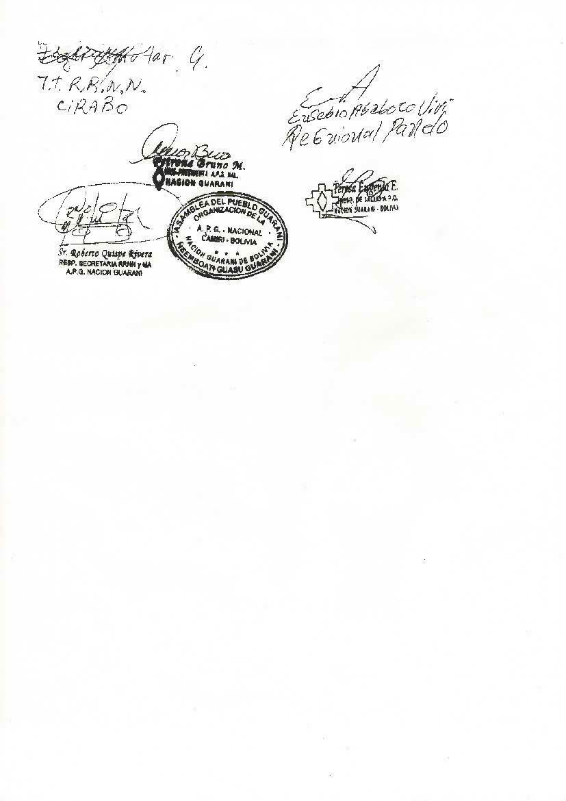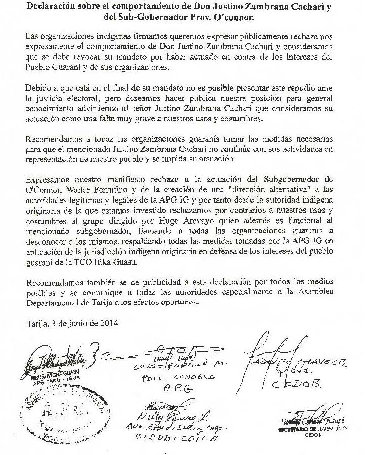 Las organizaciones indígenas firmantes queremos expresar públicamente que rechazamos expresamente el comportamiento de Don Justino Zambrana Cachari y consideramos que se debe revocar su mandato por haber actuado en contra de los intereses del Pueblo Guaraní y de sus organizaciones.