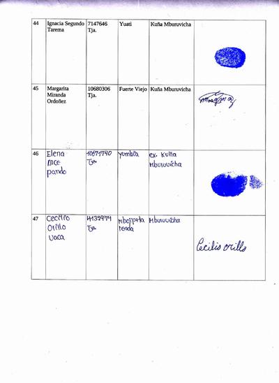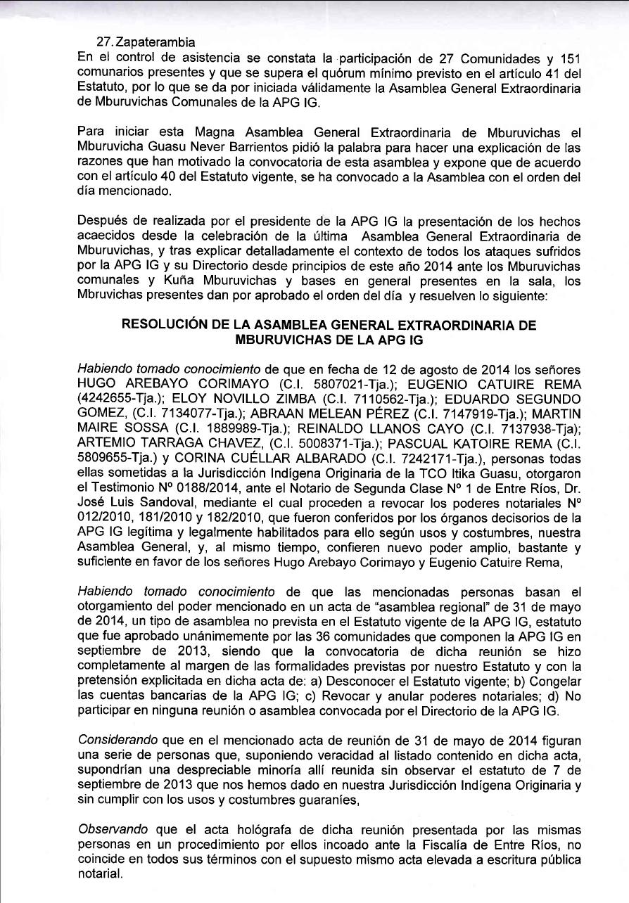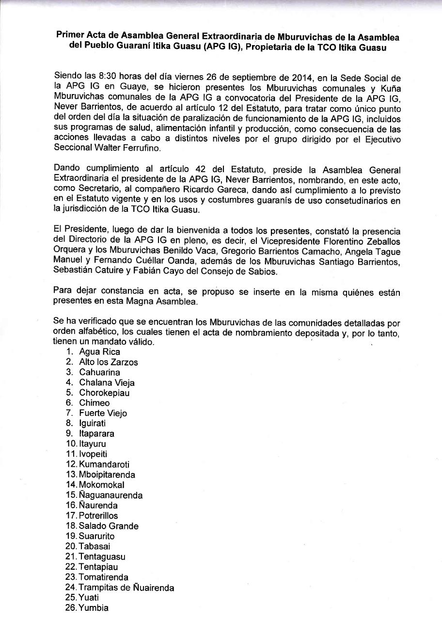 Siendo las 08:30 horas del día viernes 26 de septiembre de 2014, en la Sede Social de la APG IG en Guaye, se hicieron presentes los Mburuvichas comunales y Kuña Mburuvichas comunales de la APG IG a convocatoria del Presidente de la APG IG, Never Barrientos, de acuerdo al artículo 12 del Estatuto, para tratar como único punto del orden del día la situación de paralización de funcionamiento de la APG IG, incluidos sus programas de salud, alimentación infantil y producción, como consecuencia de las acciones llevadas a cabo a distintos niveles por el grupo dirigido por el Ejecutivo Seccional Walter Ferrufino.