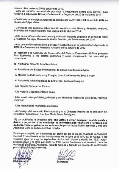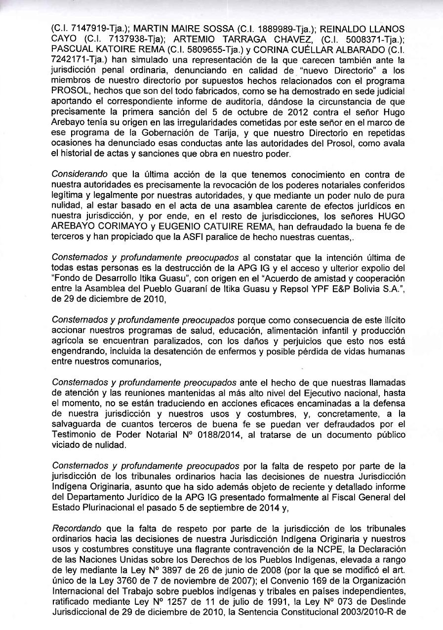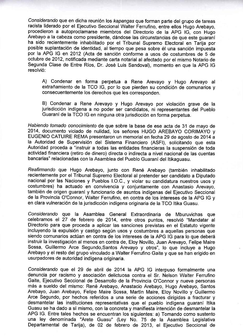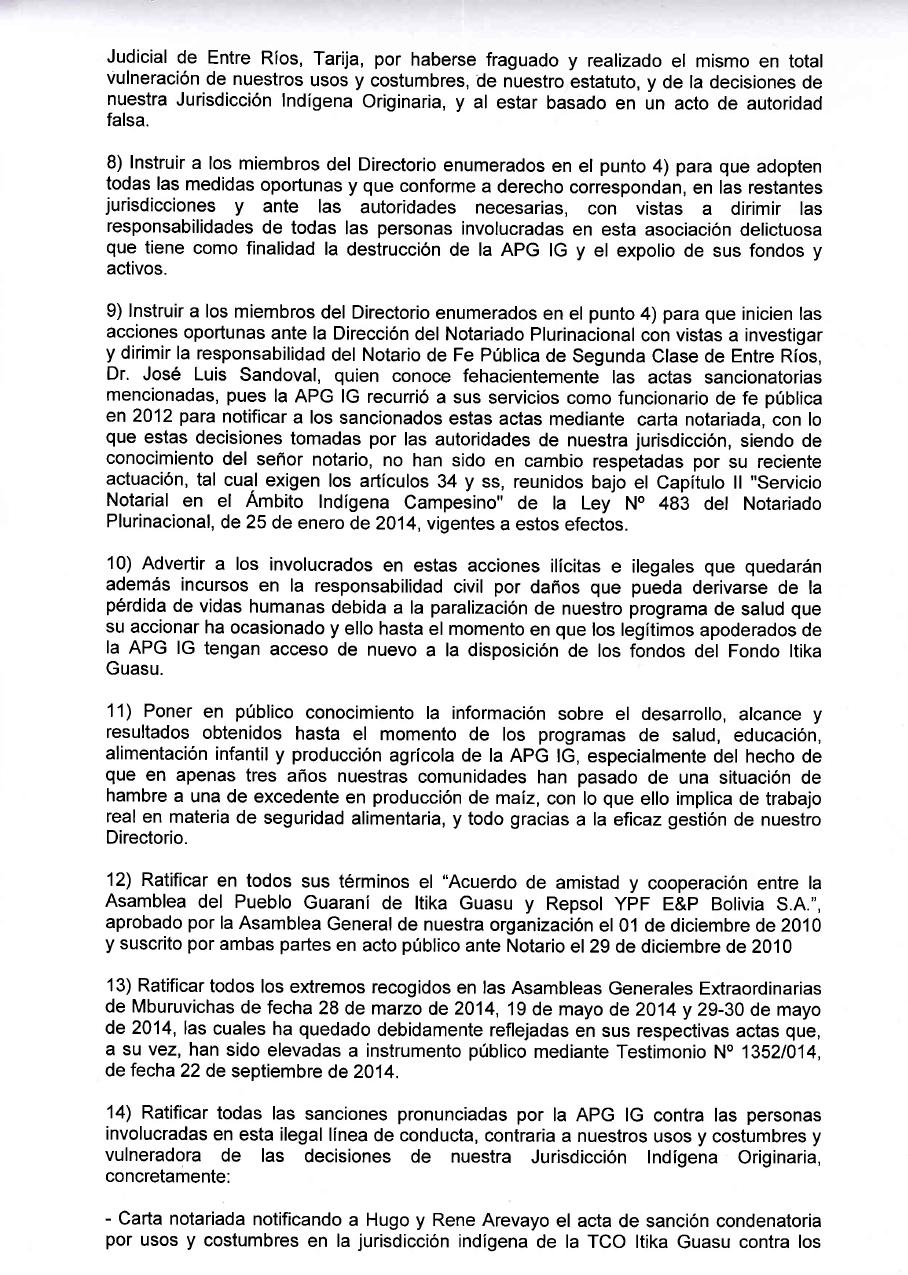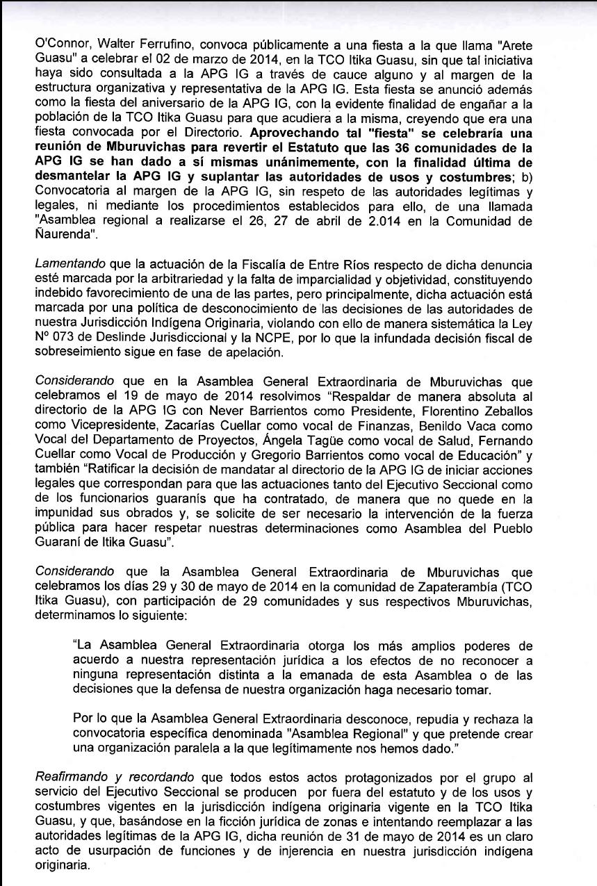 "Expresamos nuestro manifiesto rechazo a la actuación del Subgobernador de O'Connor, Walter Ferrufino y de la creación de una "dirección alternativa" a las autoridades legítimas y legales de la APG IG y por tanto desde la autoridad indígena originaria de la que estamos investidos rechazamos por contrarios a nuestros usos y costumbres al grupo dirigido por Hugo Arevayo, quien además es funcional al mencionado subgobernador, llamando a todas las organizaciones guaranís a desconocer a los mismos, respaldando todas las medidas tomadas por la APG IG en aplicación de la jurisdicción indígena originaria en defensa de los intereses del pueblo guaraní de la TCO Itika Guasu."