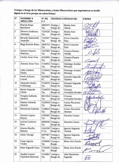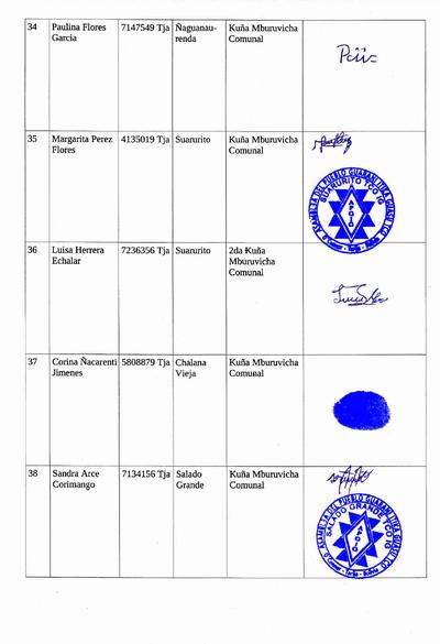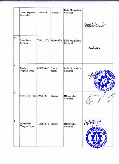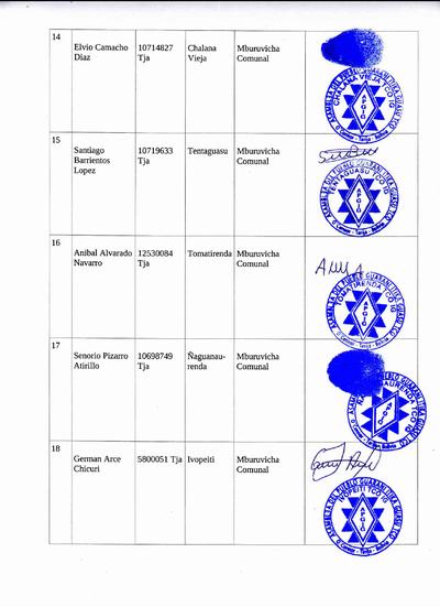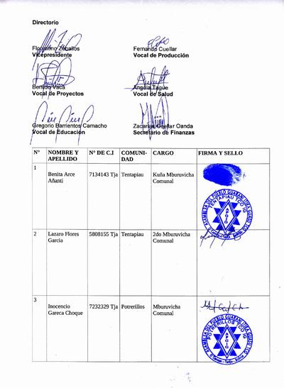 Es decir, nuestra Asamblea General de Mburuvichas adoptó estas decisiones y tomó estas disposiciones, las cuales ratificamos y mantenemos en todos sus términos, incluida la composición del Consejo de Sabios, a cuyos 5 miembros -Santiago Barrientos López, Sebastián Catuire Arebayo, Fabián Cayo Canuto, Benildo Vaca, Never Barrientos reconocemos y ratificamos.