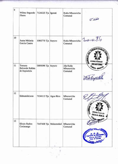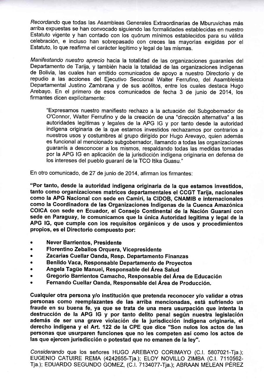 "Por tanto, desde la autoridad indígena originaria de la que estamos investidos, tanto como organizaciones matrices departamentales el CCGT Tarija, nacionales como la APG Nacional con sede en Camiri, la CIDOB, CNAMIB e internacionales como la Coordinadora de las Organizaciones Indígenas de la Cuenca Amazónica COICA con sede en Ecuador, el Consejo Continental de la Nación Guaraní con sede en Paraguay, le comunicamos que la única Autoridad legítima y legal de la APG IG, que cumple con los requisitos orgánicos y de usos y procedimientos propios, es el Directorio compuesto por: