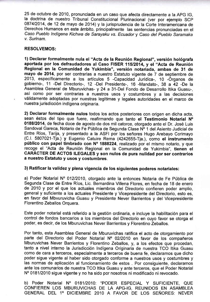 RESOLUCIÓN DE LA ASAMBLEA GENERAL EXTRAORDINARIA DE MBURUVICHAS DE LA APG IG Habiendo tomado conocimiento de que en fecha de 12 de agosto de 2014 los señores HUGO AREBAYO CORIMAYO (C.I. 5807021-Tja.); EUGENIO CATUIRE REMA (4242655-Tja.); ELOY NOVILLO ZIMBA (C.I. 7110562-Tja.); EDUARDO SEGUNDO GOMEZ, (C.I. 7134077-Tja.); ABRAAN MELEAN PÉREZ (C.I. 7147919-Tja.); MARTIN MAIRE SOSSA (C.I. 1889989-Tja.); REINALDO LLANOS CAYO (C.I. 7137938-Tja); ARTEMIO TARRAGA CHAVEZ, (C.I. 5008371-Tja.); PASCUAL KATOIRE REMA (C.I. 5809655-Tja.) y CORINA CUÉLLAR ALBARADO (C.I. 7242171-Tja.), personas todas ellas sometidas a la Jurisdicción Indígena Originaria de la TCO Itika Guasu, otorgaron el Testimonio Nº 0188/2014, ante el Notario de Segunda Clase Nº 1 de Entre Ríos, Dr. José Luis Sandoval, mediante el cual proceden a revocar los poderes notariales Nº 012/2010, 181/2010 y 182/2010, que fueron conferidos por los órganos decisorios de la APG IG legítima y legalmente habilitados para ello según usos y costumbres, nuestra Asamblea General, y, al mismo tiempo, confieren nuevo poder amplio, bastante y suficiente en favor de los señores Hugo Arebayo Corimayo y Eugenio Catuire Rema,