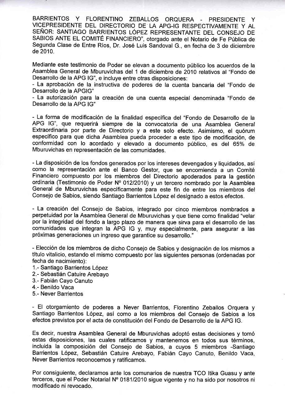 Mediante este testimonio de Poder se elevan a documento público los acuerdos de la Asamblea General de Mburuvichas del 1 de diciembre de 2010 relativos al "Fondo de Desarrollo de la APG IG", e incluye entre otras disposiciones: