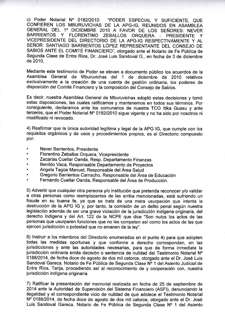 7) Ratificar la presentación del memorial realizada en fecha de 25 de septiembre de 2014 ante la Autoridad de Supervisión del Sistema Financiero (ASFI), denunciando l ailegalidad y el correspondiente vicio de nulidad de que adolece el Testimonio Notarial Nº 0188/2014, de fecha doce de agosto de dos mil catorce, otorgado ante el Dr. José Luis Sandoval Gareca, Notario de Fe Pública de Segunda Clase Nº 1 del Asiento Judicial de Entre Ríos, Tarija, por haberse fraguado y realizado el mismo en total vulneración de nuestros usos y costumbres, de nuestro estatuto, y de la decisiones de nuestra Jurisdicción Indígena Originaria, y al estar basado en un acto de autoridad falsa.