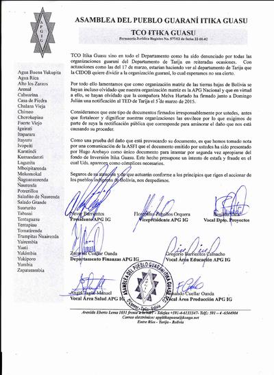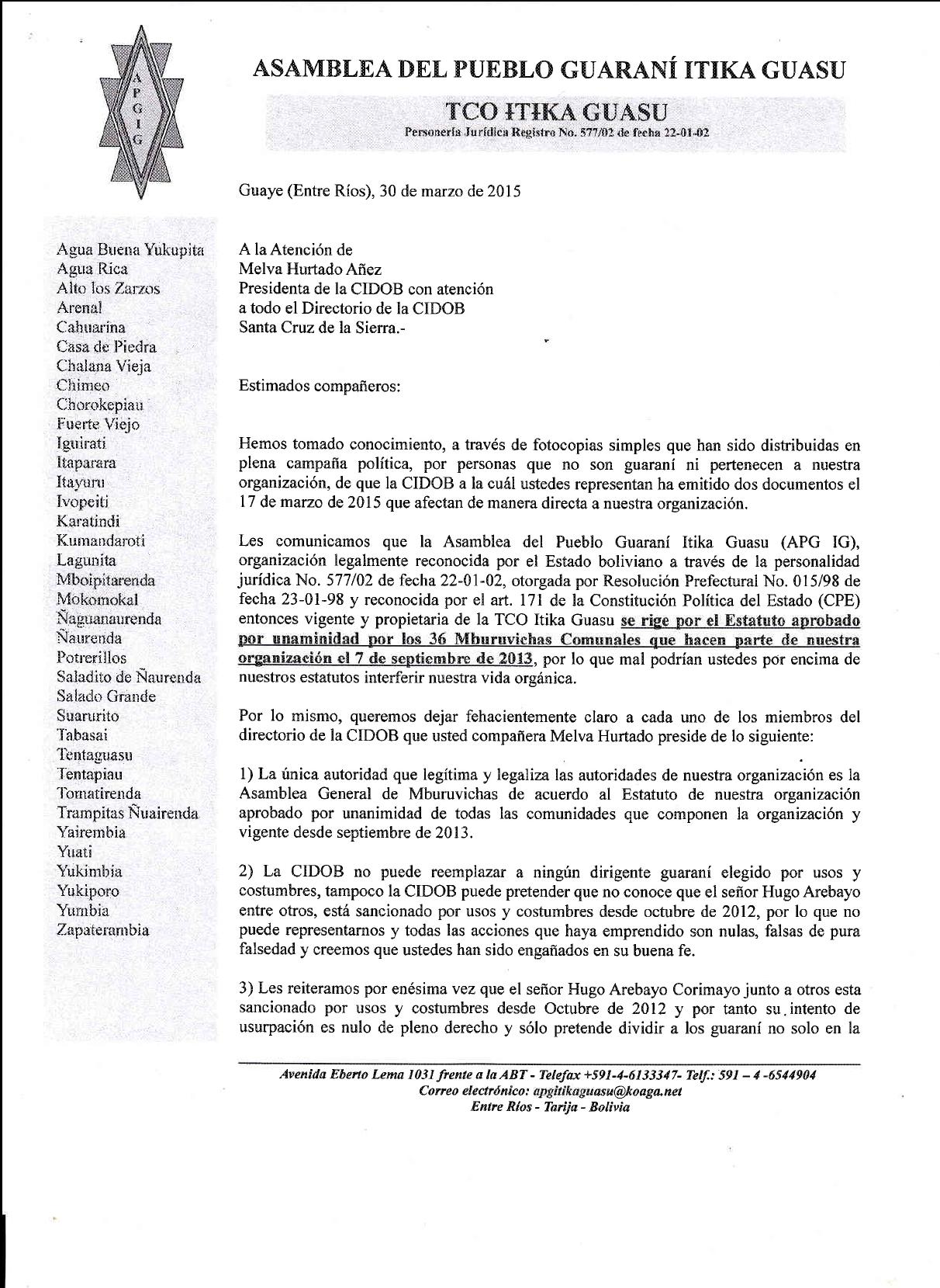 Hemos tomado conocimiento, a través de fotocopias simples que han sido distribuidas en plena campaña política, por personas que no son guaraní ni pertenecen a nuestra organización, de que la CIDOB a la cuál ustedes representan ha emitido dos documentos el 17 de marzo de 2015 que afectan de manera directa a nuestra organización.