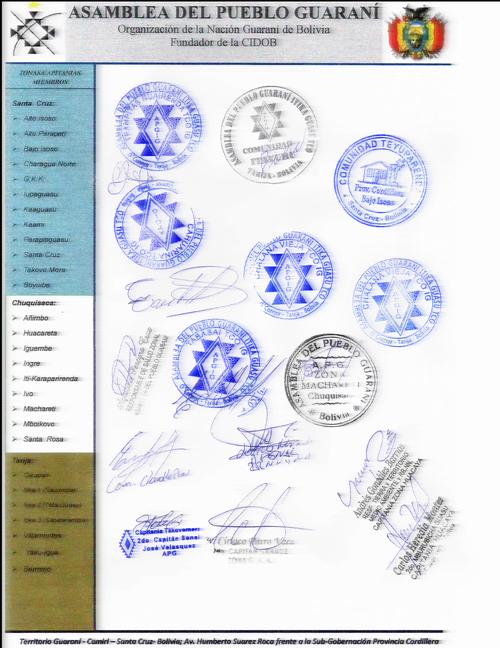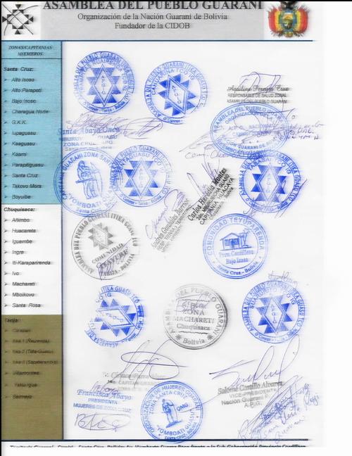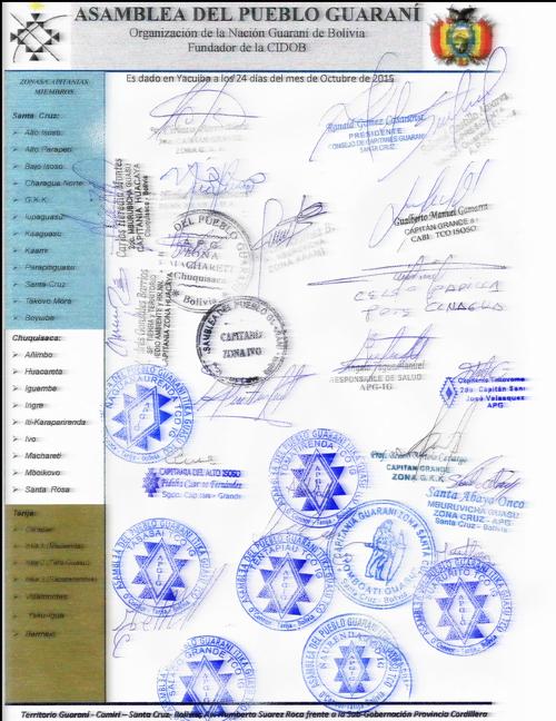Como Asamblea Nacional, a tiempo de repudiar las actuaciones delicuenciales del grupo de guaraní al mando de Hugo Arebayo Corimayo y Justino Zambrana Cachari pretendieron en desconocimiento a nuestros usos y costumbres, violentar la legalidad y legitimidad de la APG Itika Cuasu, se ha decidido por unanimidad de todas las organizaciones presentes lo siguiente: