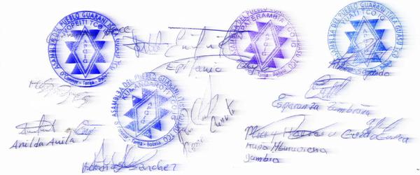 2.- Solicitamos al directorio de la APG-IG que procedan de inmediato cómo corresponde para que se aplique lo determinado del estatuto de la APG-IG en su artículo inciso a y b, para que estas sanciones se haga efectiva y se acaben los atropellos y actuaciones abusivas de este señor. Es dado en la comunidad de Kumandaroti a los tres días del mes marzo de 2016.
