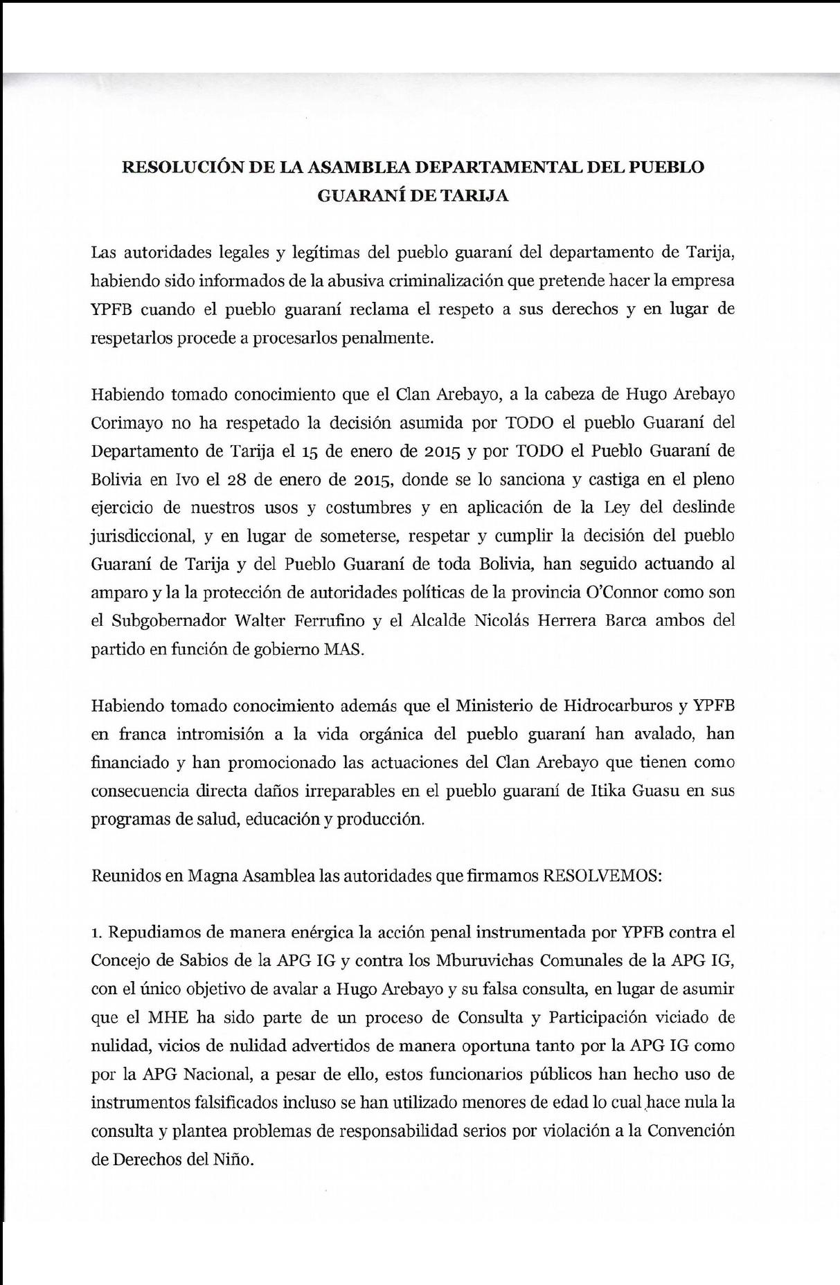 Habiendo tomado conocimiento que el Clan Arebayo, a la cabeza de Hugo Arebayo Corimayo no ha respetado la decisión asumida por TODO el pueblo Guaraní del Departamento de Tanja el 15 de enero de 2015 y por TODO el Pueblo Guaraní de Bolivia en Ivo el 28 de enero de 2015, donde se lo sanciona y castiga en el pleno ejercicio de nuestros usos y costumbres y en aplicación de la Ley del deslinde jurisdiccional, y en lugar de someterse, respetar y cumplir la decisión del pueblo Guaraní de Tarija y del Pueblo Guaraní de toda Bolivia, han seguido actuando al amparo y la la protección de autoridades políticas de la provincia O'Connor como son el Subgobernador Walter Ferrufino y el Alcalde Nicolás Herrera Barca ambos del partido en función de gobierno MAS.