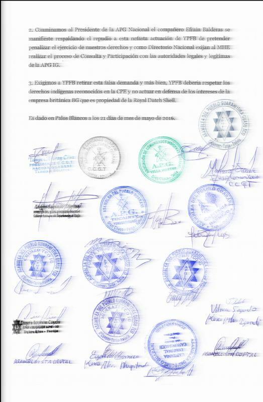 3. Exigimos a YPFB retirar esta falsa demanda y más bien, YPFB debería respetar los derechos indígenas reconocidos en la CPE y no actuar en defensa de los intereses de la empresa británica BG que es propiedad de la Royal Dutch Shell.