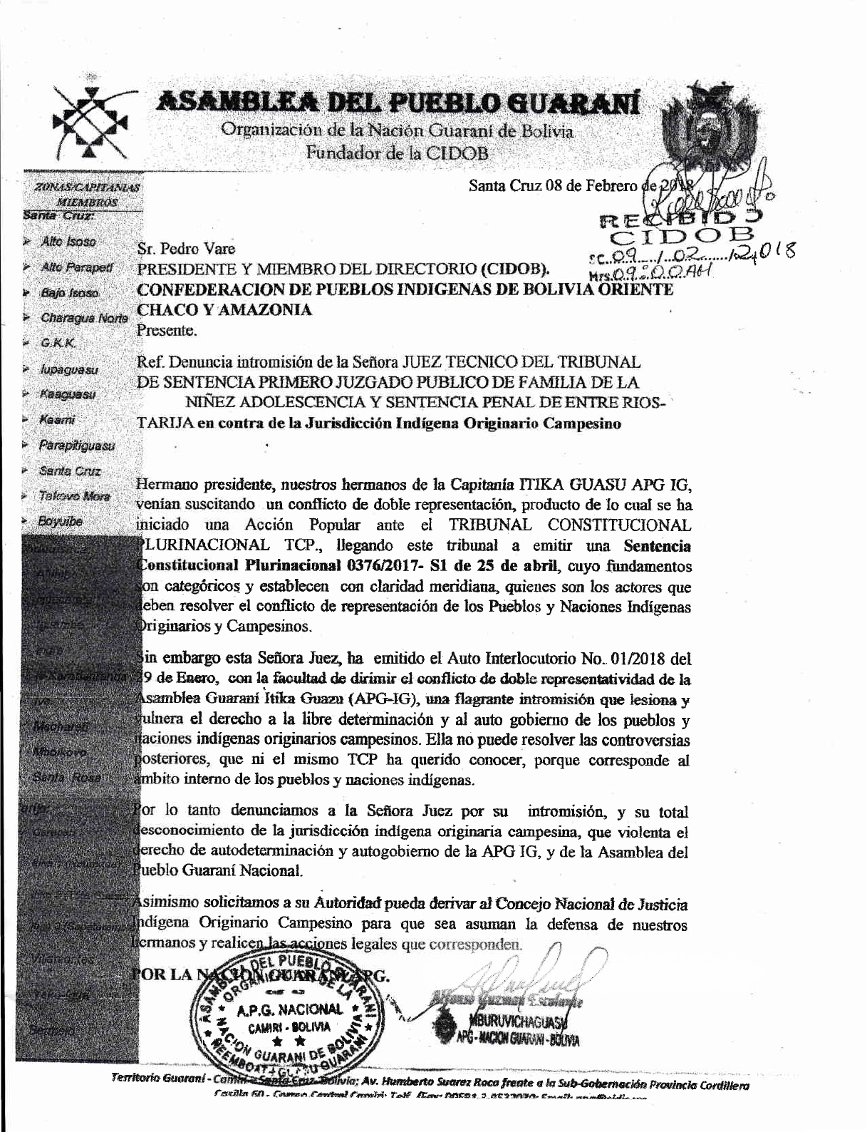 Por lo tanto denunciamos a la Señora Juez por su intromisión, y su total desconocimiento de la jurisdicción indígena originaria campesina, que violenta el derecho de autodeterminación y autogobierno de la APG IG, y de la Asamblea del Pueblo Guaraní Nacional.