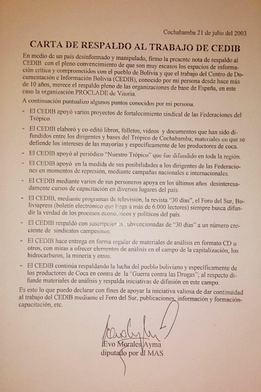 Evo Morales firmó en 2003 una carta de respaldo al trabajo de CEDIB