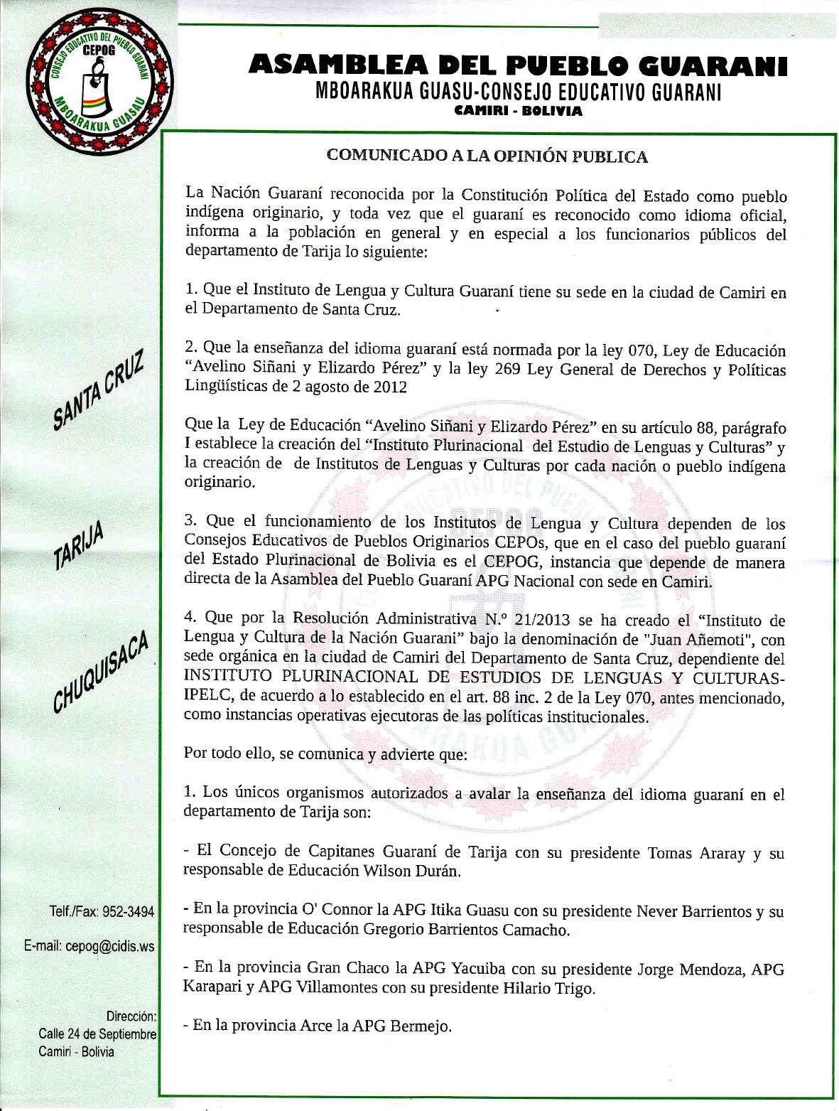 3. Que el funcionamiento de los Institutos de Lengua y Cultura dependen de los Consejos Educativos de Pueblos Originarios CEPOs, que en el caso del pueblo guaraní del Estado Plurinacional de Bolivia es el CEPOG, instancia que depende de manera directa de la Asamblea del Pueblo Guaraní APG Nacional con sede en Camiri.