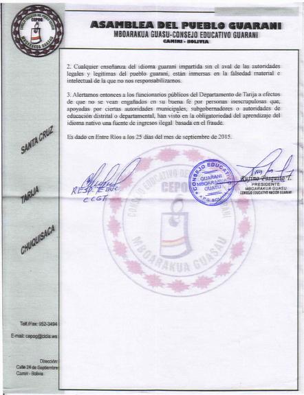 2. Cualquier enseñanza del idioma guaraní impartida sin el aval de las autoridades legales y legítimas del pueblo guaraní, están inmersas en la falsedad material e intelectual de la que no nos responsabilizamos.