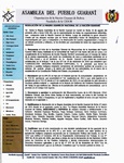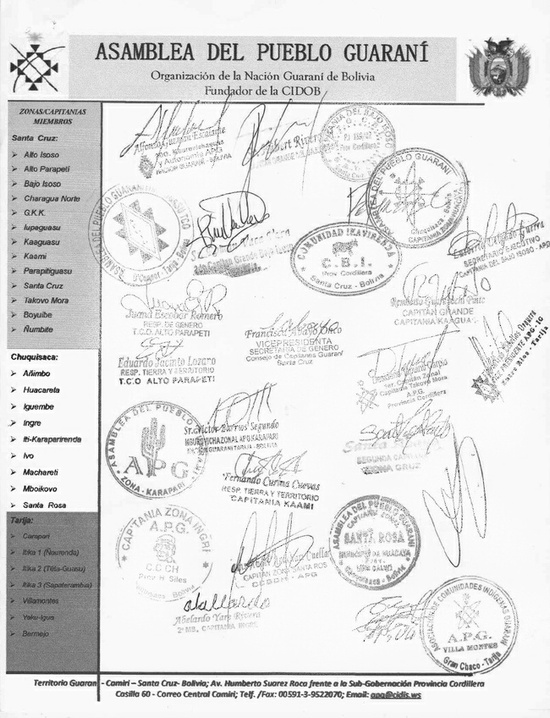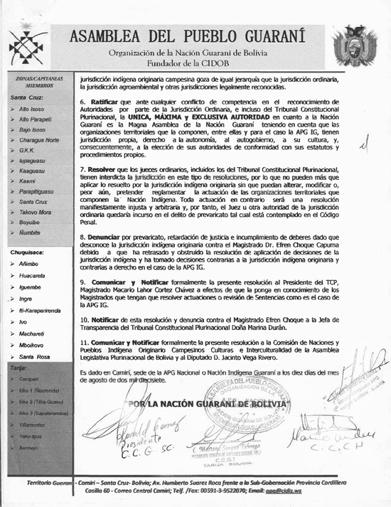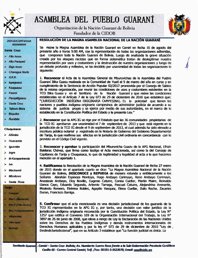 Se reúne la Magna Asamblea de la Nación Guaraní en Camirí en fecha 10 de agosto del presente año a horas 9:00 AM, con la representación de todas las organizaciones adheridas, que componen toda la Nación Guaraní de Bolivia. Luego de analizada la grave situación creada por los ataques racistas que en forma sistemática tratan de deslegitimar nuestra representación por usos y costumbres y la destrucción de nuestra organizaciones y luego de un debate profundo y reflexivo, se ha decidido por unanimidad de todas las organizaciones lo siguiente: