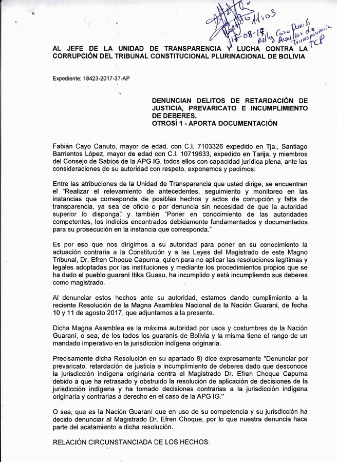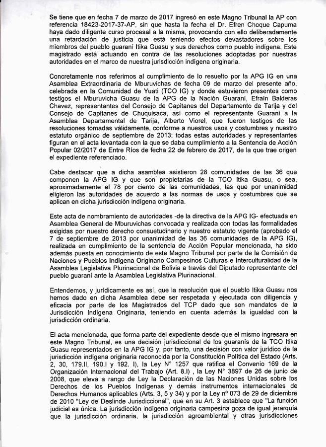 Se tiene que en fecha 7 de marzo de 2017 ingresó en este Magno Tribunal la AP con referencia 18423-2017-37-AP, sin que hasta la fecha el Dr. Efren Choque Capuma haya dado diligente curso procesal a la misma, provocando con ello deliberadamente una retardación de justicia que está teniendo efectos devastadores sobre los miembros del pueblo guaraní Itika Guasu y sus derechos como pueblo indígena. Este magistrado está actuando en contra de las resoluciones adoptadas por nuestras autoridades en el marco de nuestra jurisdicción indígena originaria.