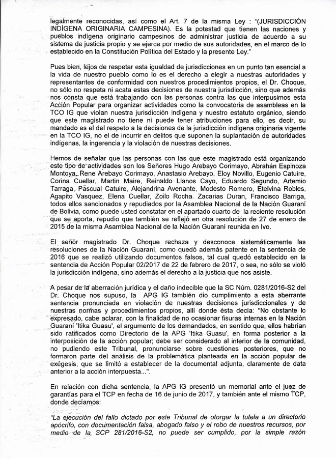 El señor magistrado Dr. Choque rechaza y desconoce sistemáticamente las resoluciones de la Nación Guaraní, como quedó además patente en la sentencia de 2016 que se realizó utilizando documentos falsos, tal cual quedó establecido en la sentencia de Acción Popular 02/2017 de 22 de febrero de 2017, o sea, no sólo se violó la jurisdicción indígena, sino además el derecho a la justicia que nos asiste.