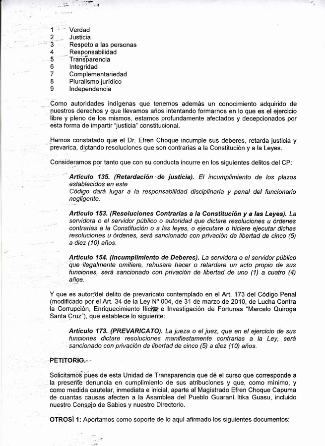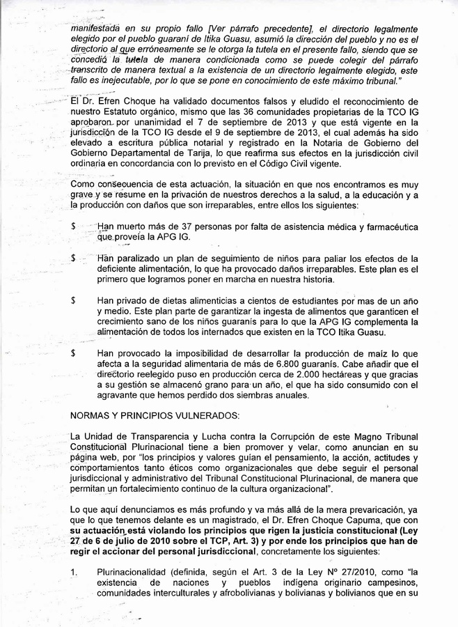 Solicitamos pues de esta Unidad de Transparencia que dé el curso que corresponde a la presente denuncia en cumplimiento de sus atribuciones y que, como mínimo, y como medida cautelar, inmediata e inicial, aparte al Magistrado Efren Choque Capuma de cuantas causas afecten a la Asamblea del Pueblo Guaraní Itika Guasu, incluido nuestro Consejo de Sabios y nuestro Directorio.