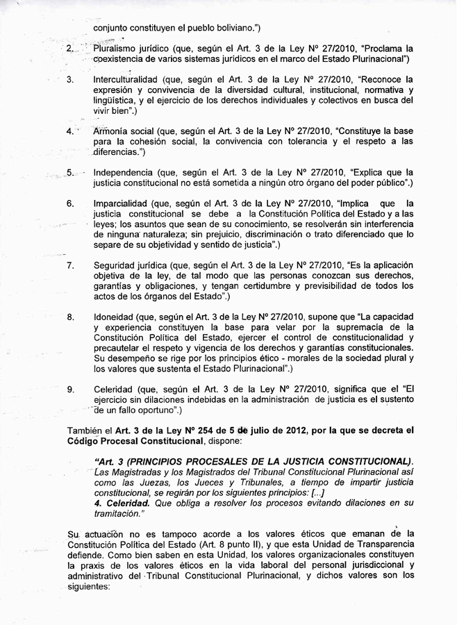 Su actuación no es tampoco acorde a los valores éticos que emanan de la Constitución Política del Estado (Art. 8 punto II), y que esta Unidad de Transparencia defiende. Como bien saben en esta Unidad, los valores organizacionales constituyen la praxis de los valores éticos en la vida laboral del personal jurisdiccional y administrativo del Tribunal Constitucional Plurinacional, y dichos valores son los siguientes: