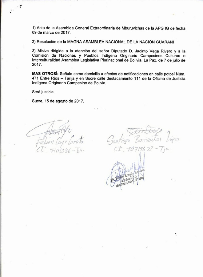 Al denunciar estos hechos ante su autoridad, estamos dando cumplimiento a la reciente Resolución de la Magna Asamblea Nacional de la Nación Guaraní, de fecha 10 y 11 de agosto 2017, que adjuntamos a la presente.