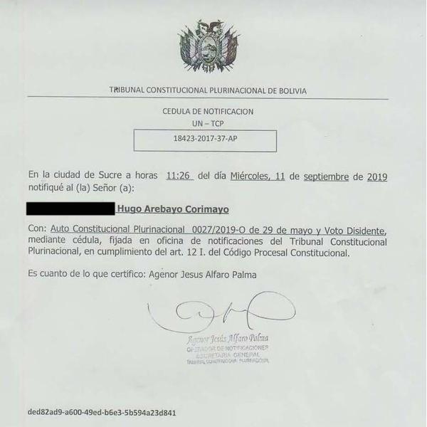 6) El Tribunal Constitucional Plurinacional notificó el Auto Constitucional Plurinacional 0027/2019-0 a Hugo Arebayo el 11 de septiembre de 2019 en Sucre.
