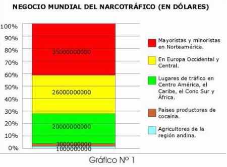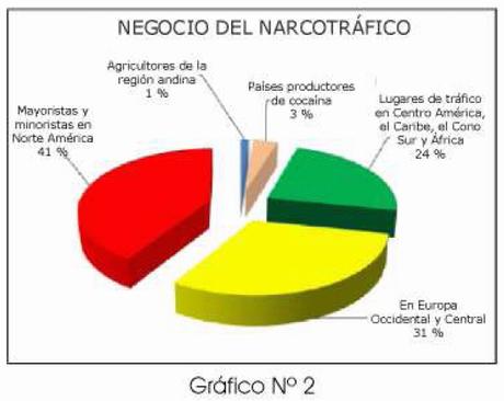 El gráfico 1 que se adjunta es muy ilustrativo de la composición o participación de los componentes de la cadena del narcotráfico. Los beneficios brutos de la venta de cocaína son de alrededor de 85 mil millones de dólares. La mayor parte de los beneficios brutos (vendedores mayorista y minorista) se generan en América del Norte (35 mil millones de dólares) y en Europa Occidental y Central (26 mil millones de dólares). En otras palabras, este es un negocio transnacional donde los capitalistas del comercio de las drogas son los que se llevan el 72% de las ganancias. (Ver también el gráfico Nº 2).