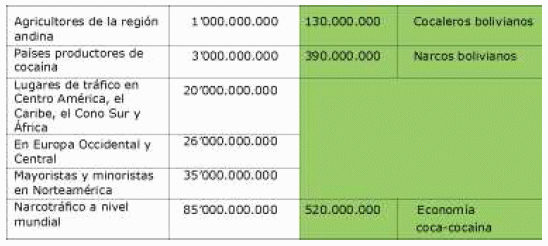 De manera curiosa, el Vicepresidente García Linera, matemático de profesión, en una conferencia de prensa semanas atrás, realizó un gran esfuerzo de cálculo para decir que el año 2010, entre el 1,5% y el 3% del total de la economía boliviana «puede provenir de ingresos relacionados con el narcotráfico. Explicó que esos porcentajes representan de 300 a 700 millones de dólares en el PIB, de 17.000 millones de dólares», sin embargo nosotros sabemos --con mayor precisión-- que los cocaleros perciben 130 millones de dólares por la venta de la hoja de coca y que los narcos bolivianos usufructúan aproximadamente 390 millones de dólares, generándose una economía dentro de la cadena, de 520 millones de dólares, es decir del 3,05% y con tendencia a incrementarse debido a las políticas que hoy se asumen en Bolivia. En el siguiente cuadro se observan estos montos detallados: