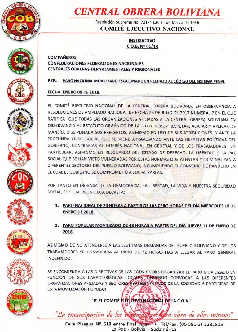 La Central Obrera Boliviana (COB) convocó este lunes a un paro nacional de 24 horas para el próximo miércoles en rechazo al Código de Sistema Penal, por considerar atentatorio al derecho, a la libertad de expresión y a la vigencia de los sindicatos del país.