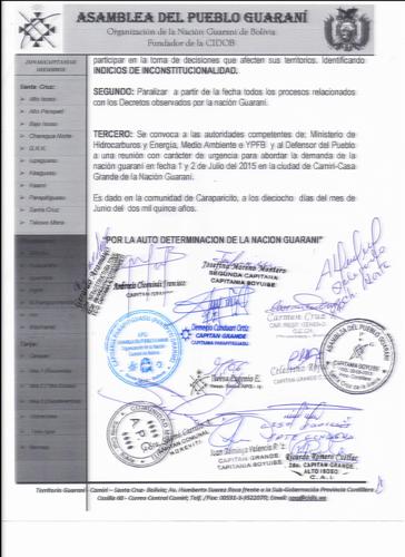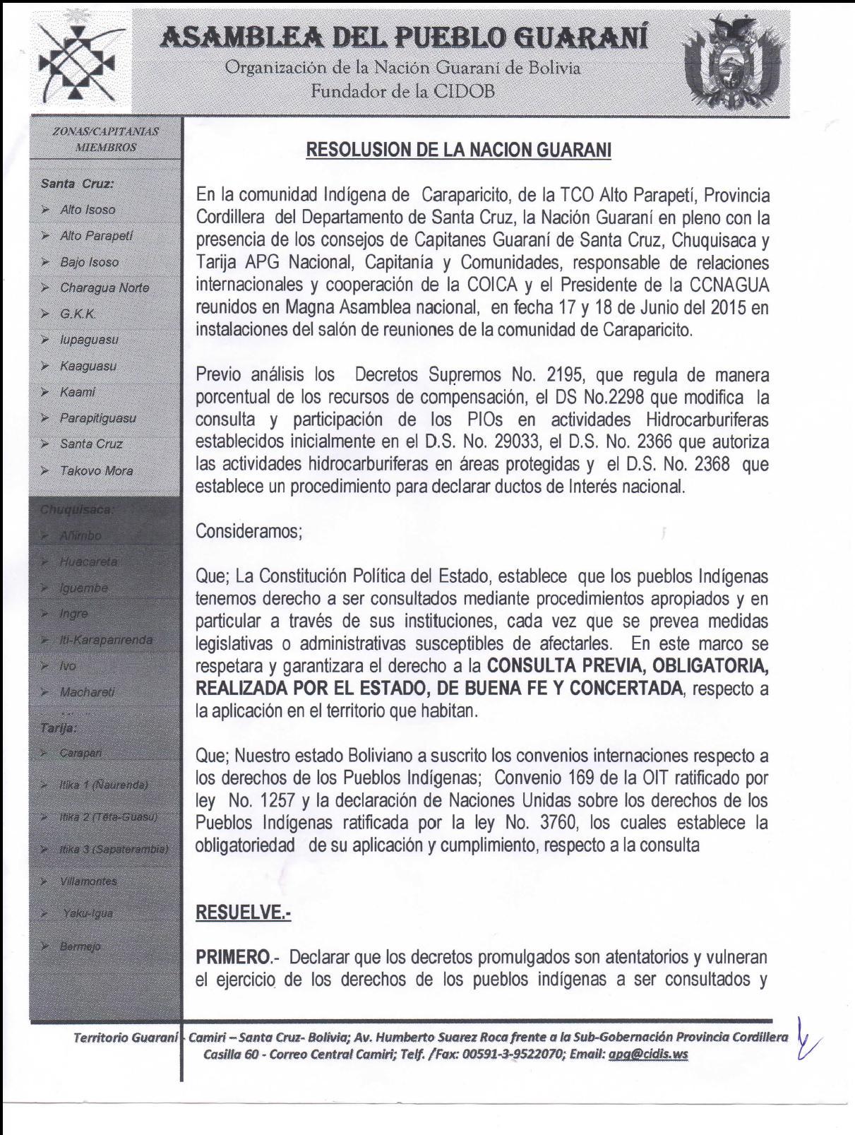 RESOLUSION DE LA NACION GUARANI En la comunidad Indígena de Caraparicito, de la TCO Alto Parapeti, Provincia Cordillera del Departamento de Santa Cruz, la Nación Guaraní en pleno con la presencia de los consejos de Capitanes Guaraní de Santa Cruz, Chuquísaca y Tarija APG Nacional, Capitanía y Comunidades, responsable de relaciones internacionales y cooperación de la COICA y el Presidente de la CCNAGUA reunidos en Magna Asamblea nacional, en fecha 17 y 18 de Junio del 2015 en instalaciones del salón de reuniones de la comunidad de Caraparicito.