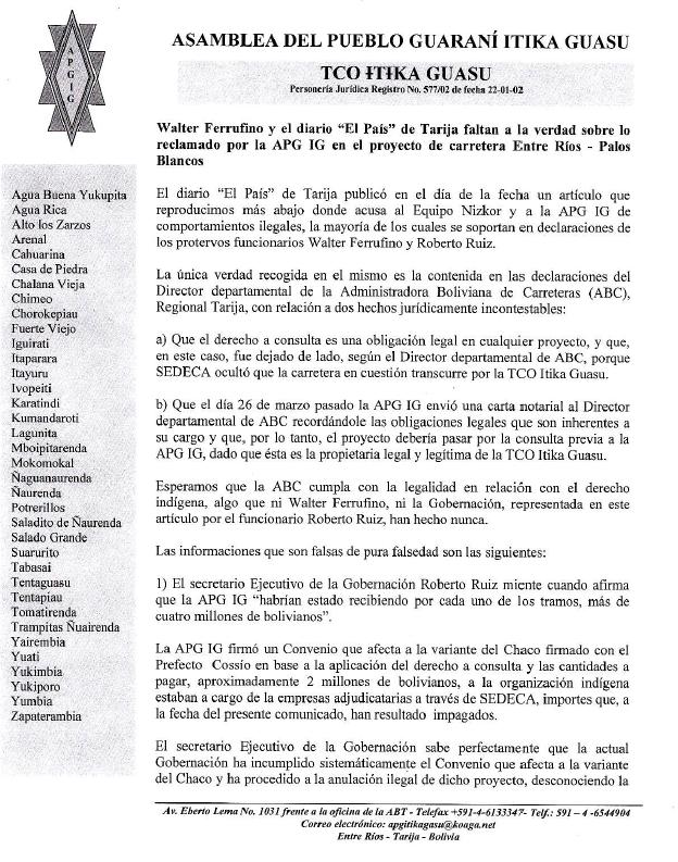 Walter Ferrufino y el diario "El País" de Tarija faltan a la verdad sobre lo reclamado por la APG IG en el proyecto de carretera Entre Ríos - Palos Blancos